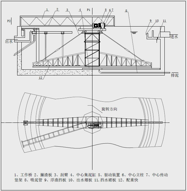 用途及簡(jiǎn)介: 中心傳動(dòng)單管吸泥機(jī)用于城市污水處理廠(chǎng)和工業(yè)廢水處理中直徑較大的圓形沉淀池特別是二沉淀中,排除沉降在池底的污泥和撇除池面的浮渣。該系列吸泥機(jī)既適用于周邊出水的二沉淀,也適用于中心進(jìn)水周邊出水的二沉淀。 結(jié)構(gòu)和工作原理: ZDX型中心傳動(dòng)單管吸泥機(jī)由工作橋、撇渣板、刮臂、中心集泥缸、驅(qū)動(dòng)裝置、中心立柱、中心轉(zhuǎn)動(dòng)豎架、吸泥管、浮渣擋板、出水堰板、擋水裙板、配重塊等組成。 該設(shè)備采用中心傳動(dòng)、垂架式,污水進(jìn)入周邊配水槽內(nèi),經(jīng)槽底配水孔均勻流入池內(nèi),并在周邊擋水裙板的作用下,水流從池底流向中心,污泥依靠自重沉積于池底,從而形成泥水分離,驅(qū)動(dòng)裝置驅(qū)動(dòng)中心豎架旋轉(zhuǎn),并帶動(dòng)刮臂及吸泥管旋轉(zhuǎn),在靜水壓力的作用下,污泥均勻地進(jìn)入吸管上布置的吸口,然后通過(guò)中心排泥井的套筒閥排出池外。排泥量的大小可由套筒閥的升降度來(lái)控制,水面的浮渣通過(guò)撇清裝置撇向池邊,再由刮渣耙刮進(jìn)排渣斗內(nèi)排出池外。